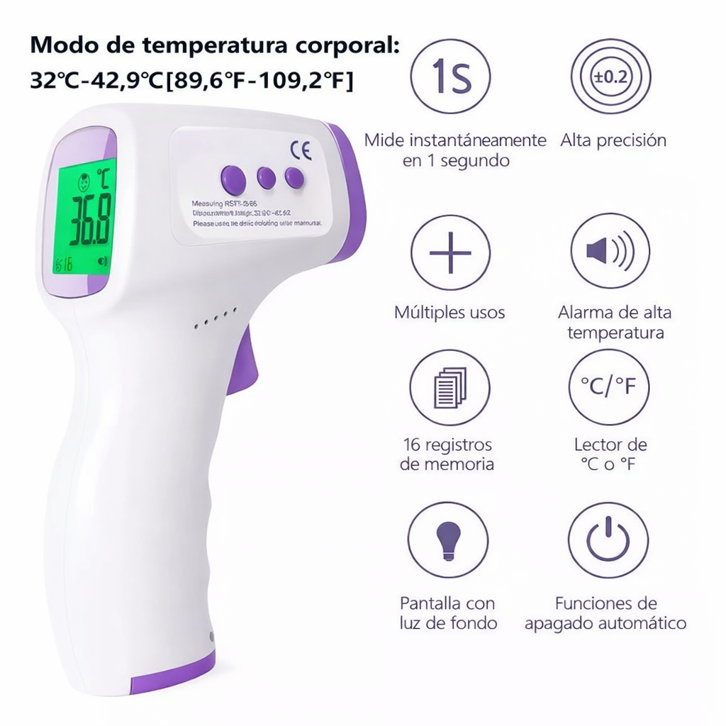 Mide la temperatura de forma rápida, precisa y sin contacto, ideal para el hogar, clínicas, oficinas y cuidado familiar. Su tecnología infrarroja permite obtener resultados en solo 1 segundo, evitando el contacto directo y garantizando mayor higiene.