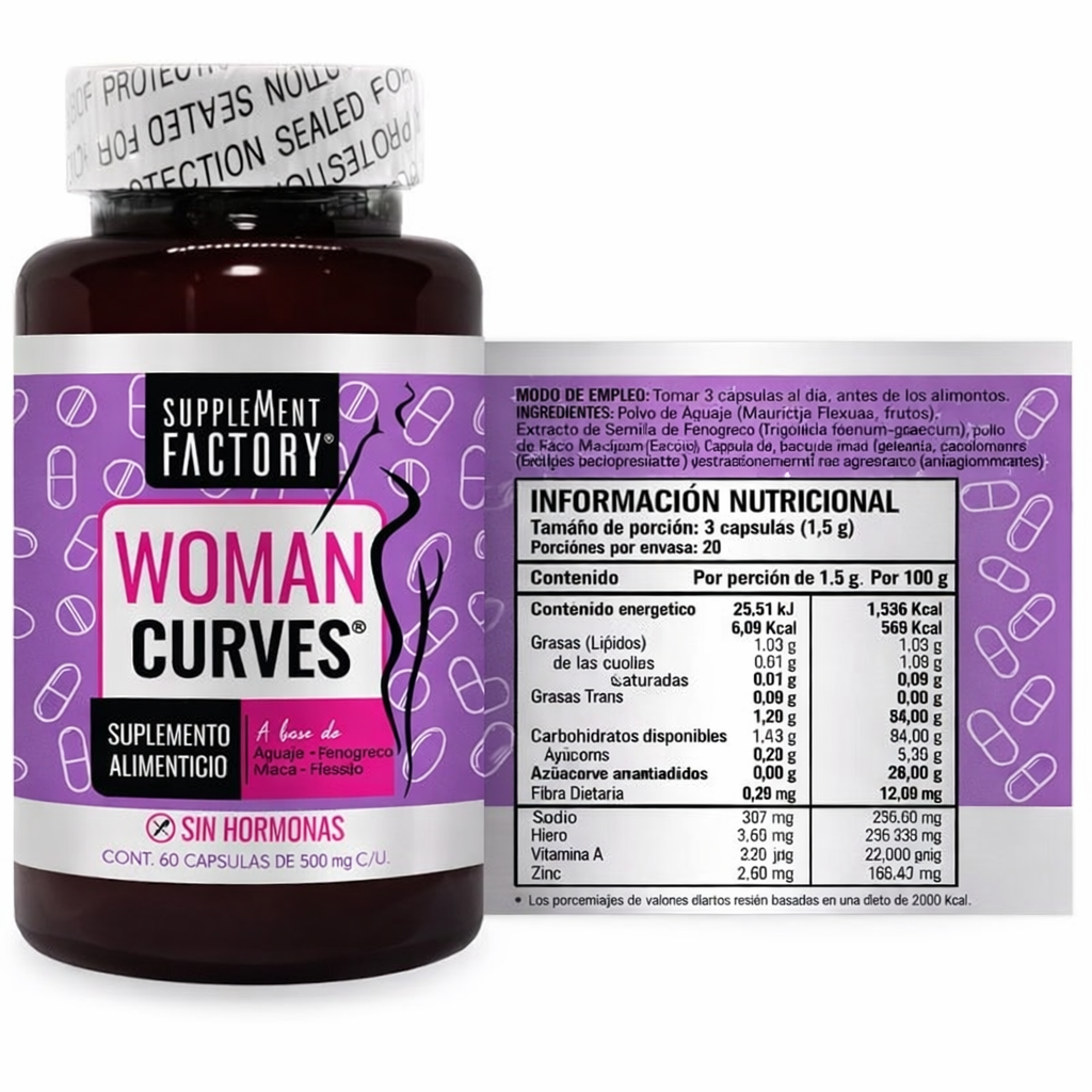 Woman Curves combina Maca, Aguaje, Fenogreco e Hinojo para ayudarte a aumentar busto y glúteos de forma segura y natural.
