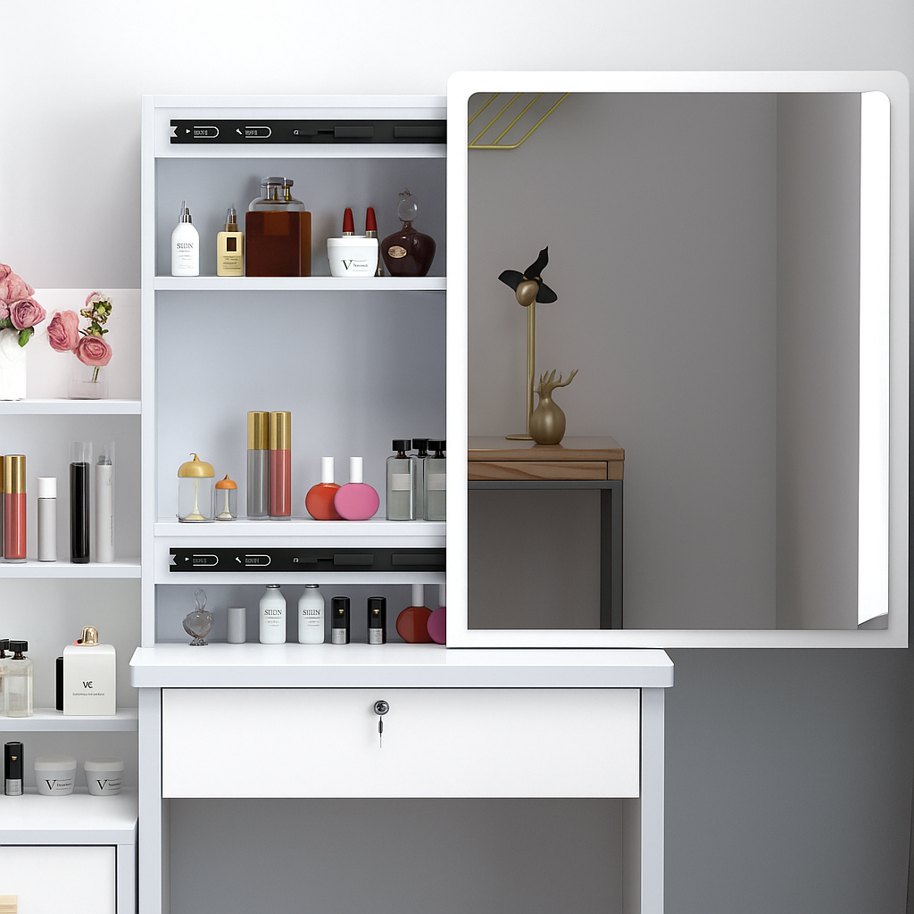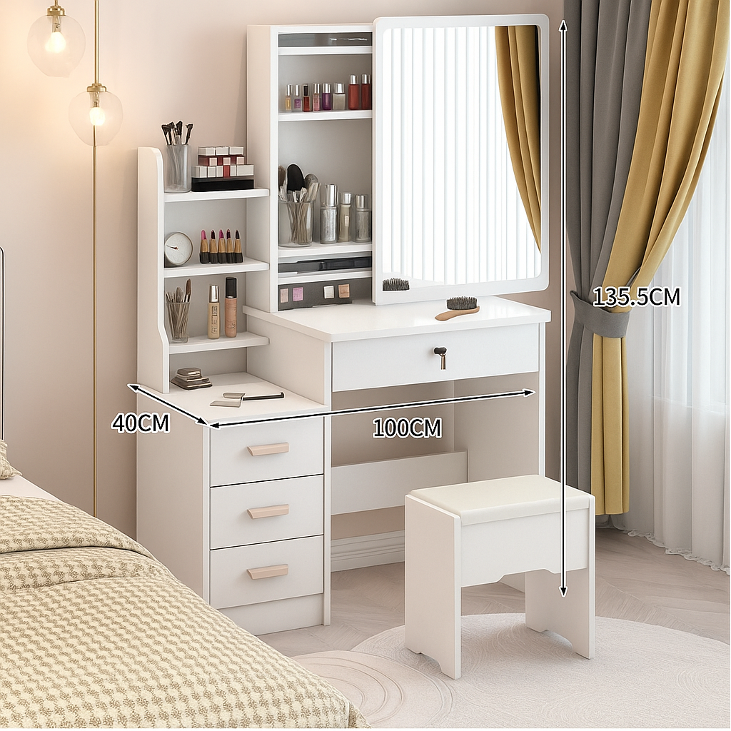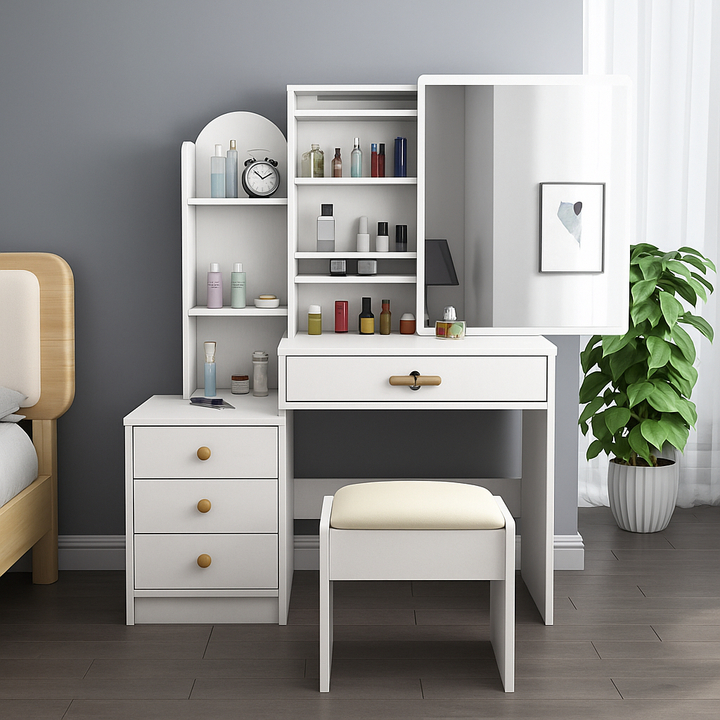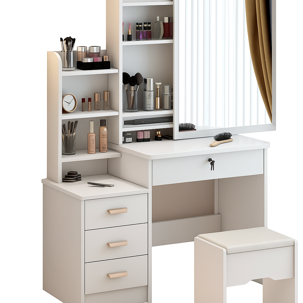 Este Tocador XL con espejo movible y taburete a juego está diseñado para ayudarte a arreglarte con comodidad, guardar todo tu maquillaje y accesorios, y darle a tu cuarto un toque moderno y sofisticado.