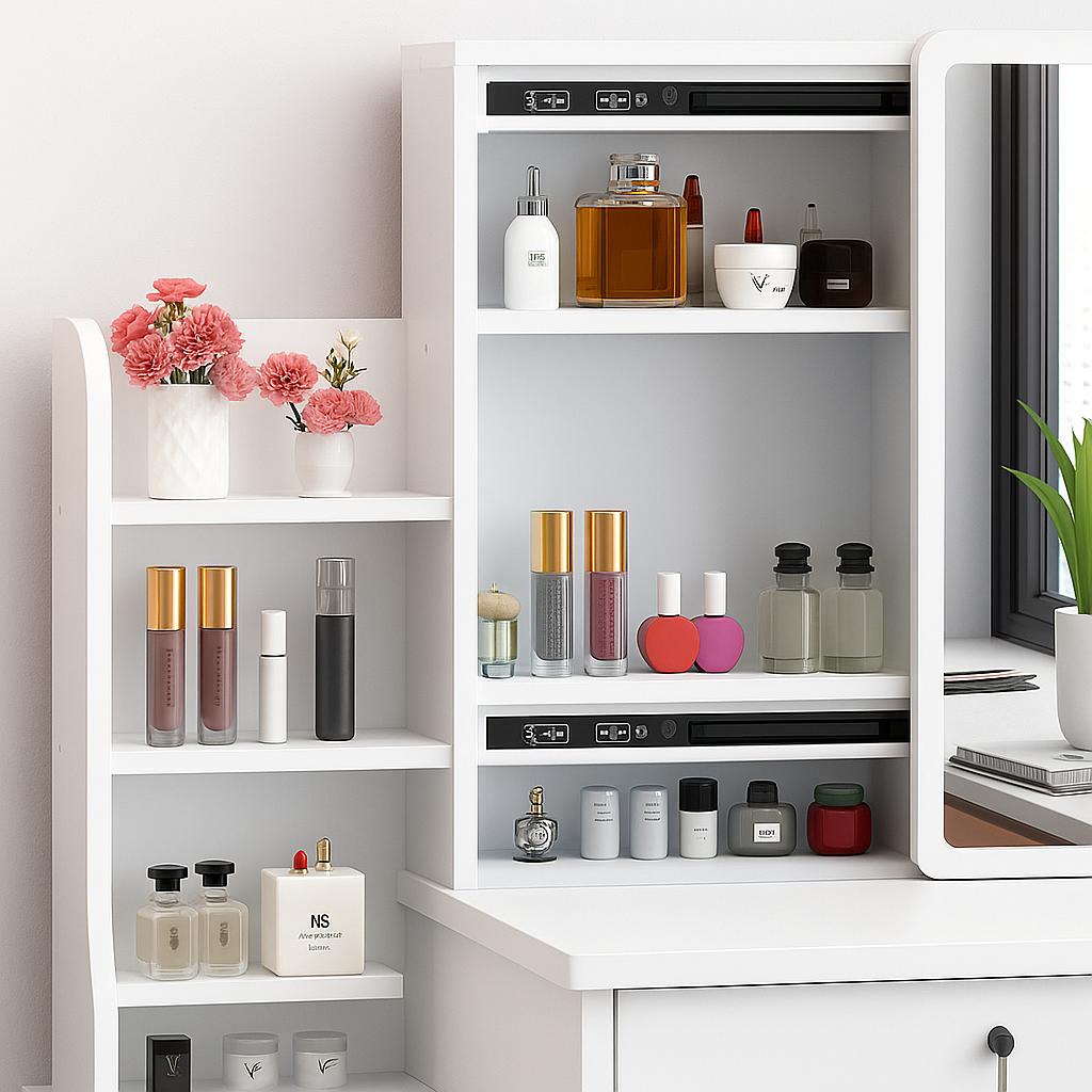 Amplia superficie → Espacio para perfumes, brochas, cremas y accesorios.